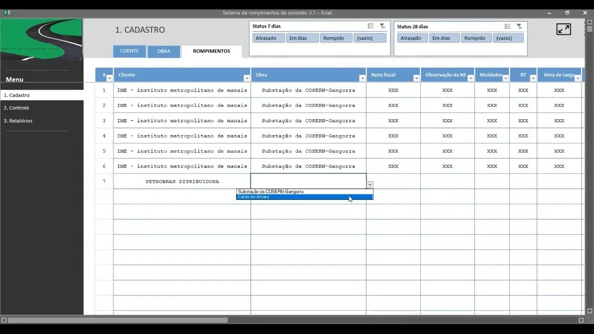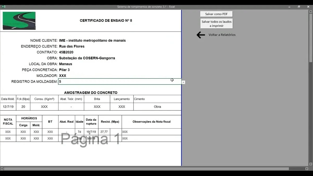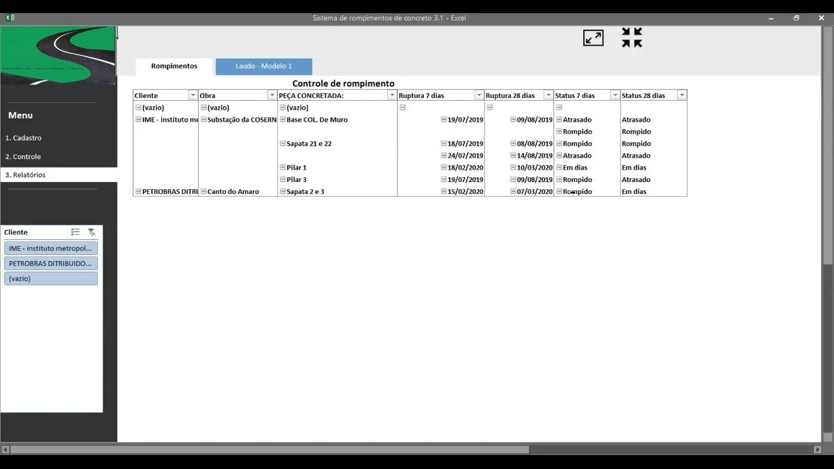 Adquira agora a planilha para dimensionamento de rompimento de corpo de prova mais completa do mercado. Essa planilha controla clientes, obras e cada corpo de prova moldado. Além de fornecer um calendário de rompimentos e um modelo de laudo final.